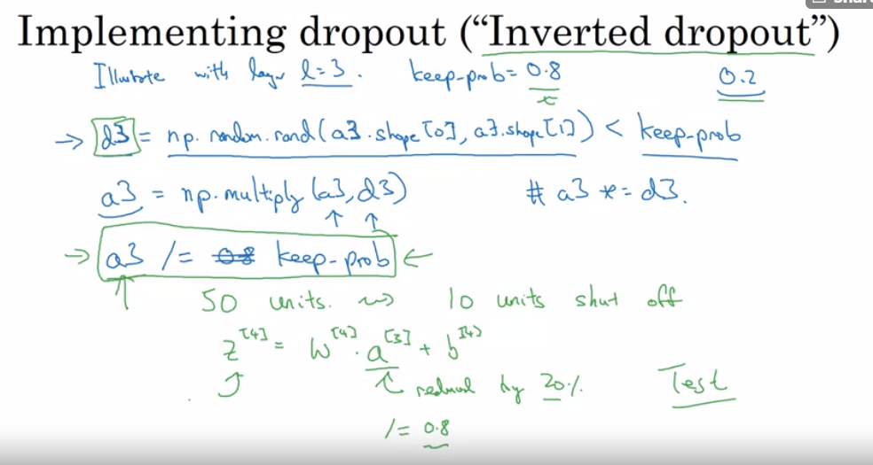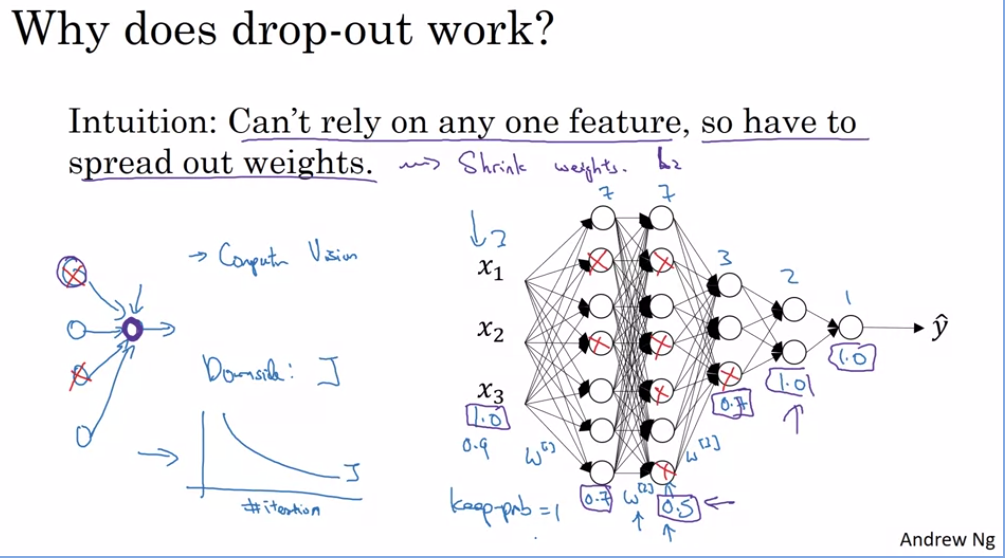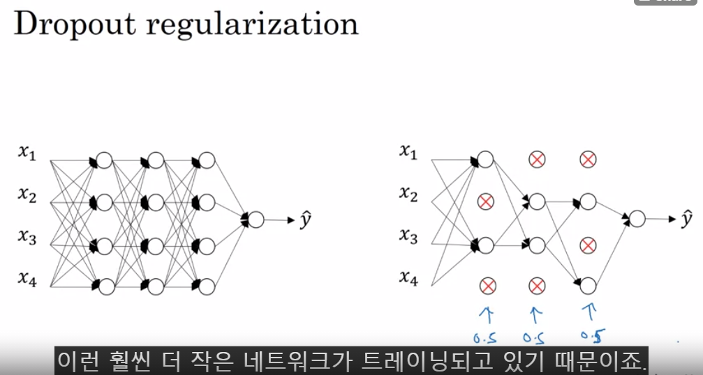 - 애초에 노드를 제거하고 시작하는 것과는 다르다. Dropout 방식은 iteration 마다(backward propagation, forward propagation 할때 모두) 그 확률에 따라 random하게 노드를 제거하므로, 매번 제거되는 노드가 다르다.