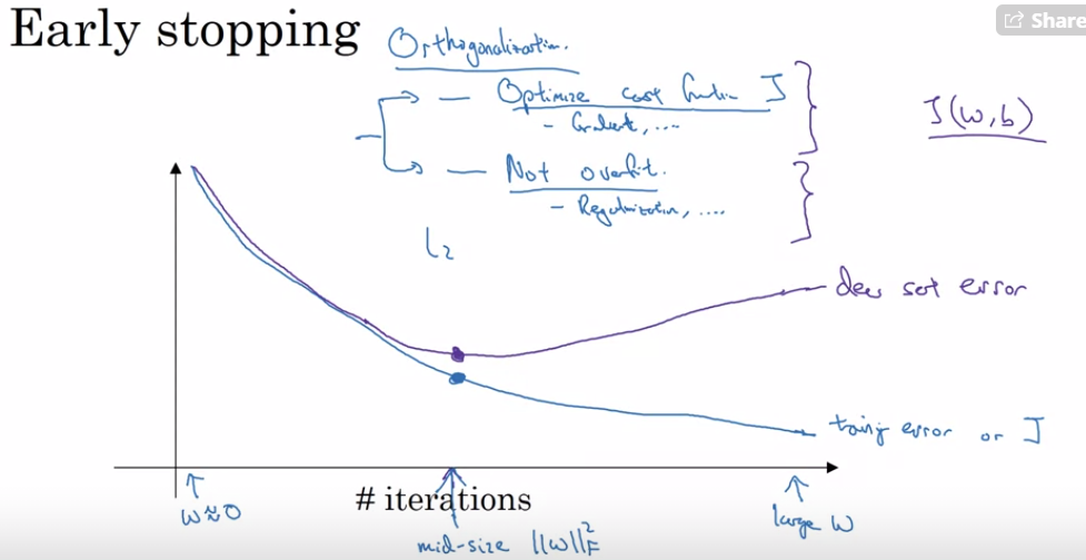 - 데이터를 무한정을 학습시키는 것이 아니라 dev error가 최소인 지점까지 혹은 그대로인 지점까지만 학습하는 것.