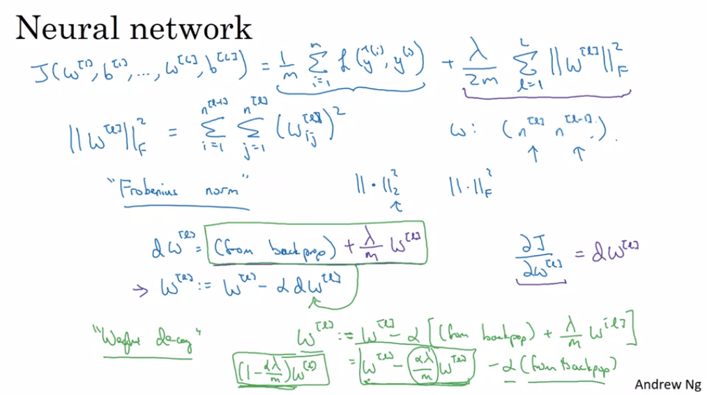 - NN(Neural Network)에서 W[l]은 행렬 형태임. 따라서 L2방식을 이용할 때, 모든 행과 열의 요소에 대해서 제곱하여 더해야 하므로 위와 같이 시그마가 2개임. 저기에 모든 층의 W 값을 제곱하여 더하려면 마지막에 layer에 대한 시그마가 추가되는 것. 왜인지는 모르겠지만 이를 선형대수학에서 L2방식이 아니라 Frobenius norm이라고 함. 신경안써도 됨.