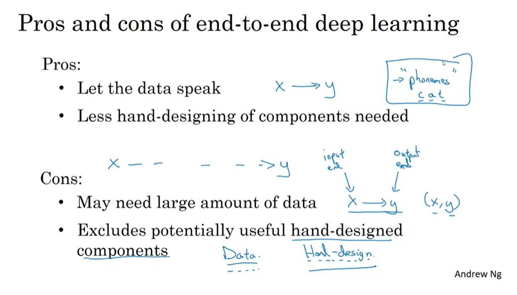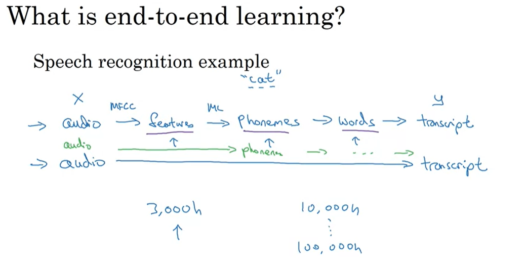 전통적으로는 위쪽과 같이 여러 단계를 거치면서 최종 결과물을 산출하나, end-to-end 방식은 audio에서 바로 transcript를 산출한다. 이게 가능해지는 이유는 더 많은 데이터가 학습되었기 때문.