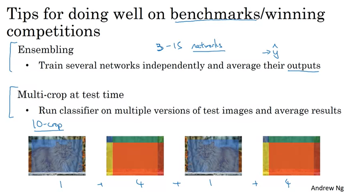 - Multi-crop at test time은 data augmentation을 test set에 적용하는 것. 속도 저하가 있지만, 앙상블에 비해 메모리 공간은 적게 차지한다. 1개의 네트워크만 저장하면 되기 때문. 물론 이것도 production 단계에서는 안됨.