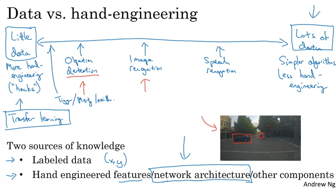 object detection처럼 데이터가 적은 분야에서는 알고리즘이 복잡해지고 hand-engineer을 하는 경향이 있다. 실제로 도움이 되기도 하고. 반면 데이터가 정말 많으면 알고리즘은 간단해지고 hand-engineer에 시간을 많이 할애하지 않는다. 차라리 learning system 자체에 집중함.