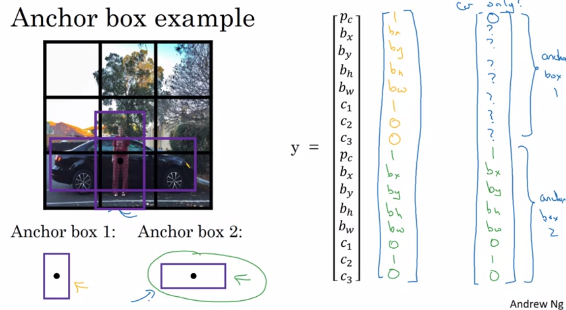 그래서 미리 anchor box를 만들어 놓고 y label을 anchor box의 수만큼 확장한 후, 각각의 부분이 anchor box 1~n과 얼마나 유사한지 Pc값으로 나타낸다.