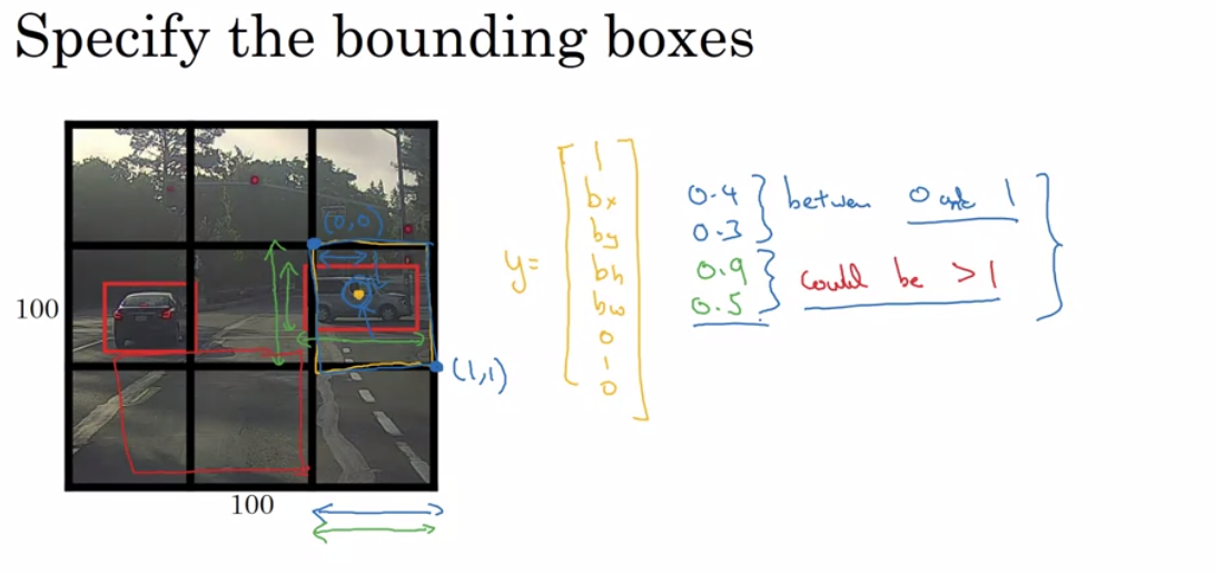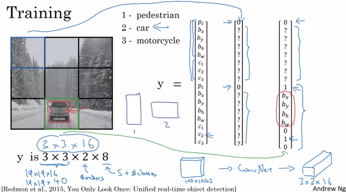 - 별건 아니고 input image를 일정한 grid cell로 나누어서 각각에 classification with localization을 수행한다고 생각하면 된다. 따라서 각 grid cell 별로 8개의 label y가 할당되어야 함. 즉, 3x3 으로 나눈다고 했을 때, 한 이미지를 넣으면 3x3x8의 y를 output해야함. 그렇게 만든 (x,y) training set으로 모델을 훈련시키는게 YOLO다 이말이야.
