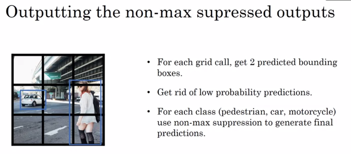 좀 참고할 점은 모든 class(보행자, 차 등)에 대해 non-max suppression 을 수행해야한다.