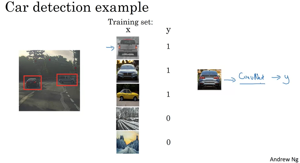 우선 car classification 모델을 Conv를 이용해 따로 만든다. 이 때 y=1 즉, 자동차가 있는 사진은 자동차만 들어가게끔 바싹 잘라서 training set으로 만들어준다(sliding window 방법에서 추출한 사진 또한 그와 비슷한 input이 될 것이기 때문에 이렇게 하는 듯).