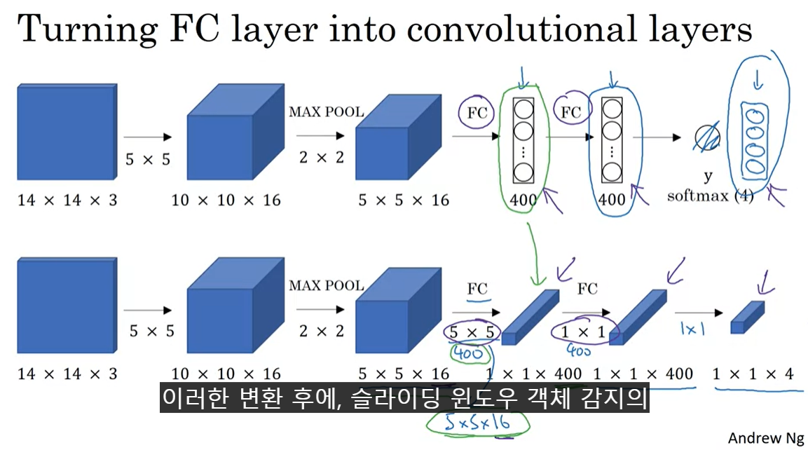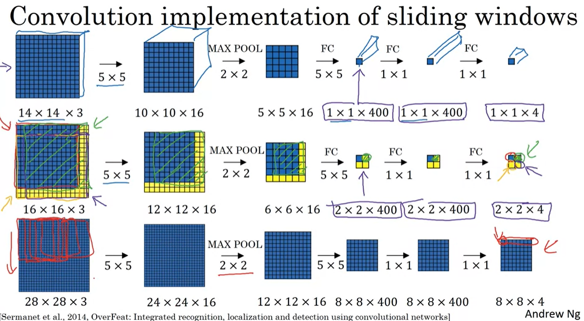 왜 이렇게 될까? 이게 가능한 이유는 conv 연산이 이미 sliding 방식으로 이루어지기 때문이다. 전체 사진에서 sliding window 부분만 띄어서 생각해보면 결국 output이 차례대로 쌓인다.