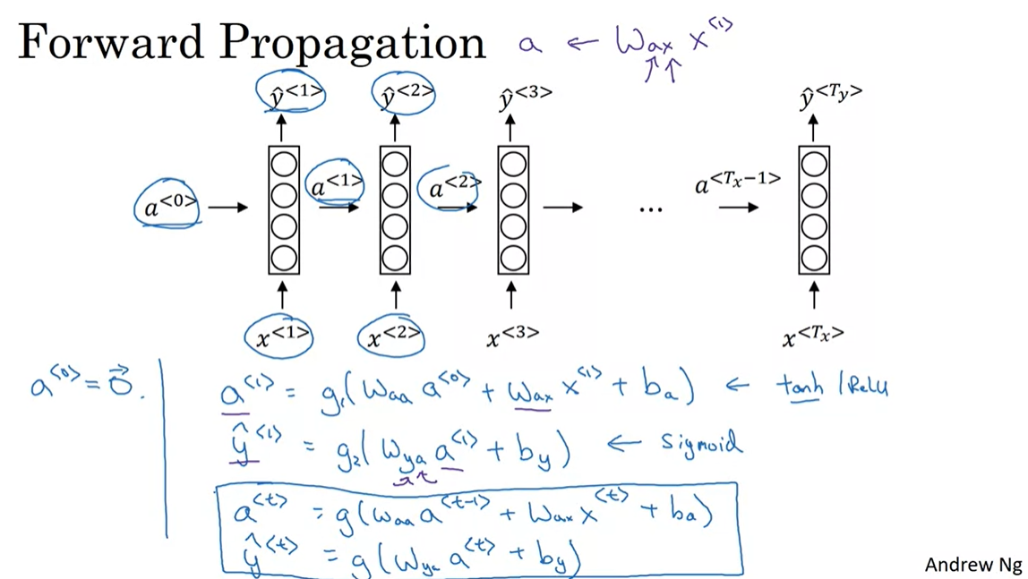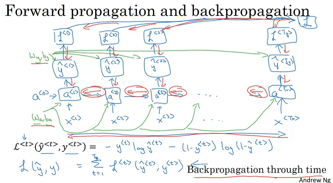 - Wa, ba, Wy, by 는 위와 같이 다 공유된다. 생각해보면 당연한거다. 결국 x<t> 각각은 input의 한 요소들인데 그 요소들에게 공통적인 weight를 취해줘야겠지. 일반적인 NN과 동일한 것.