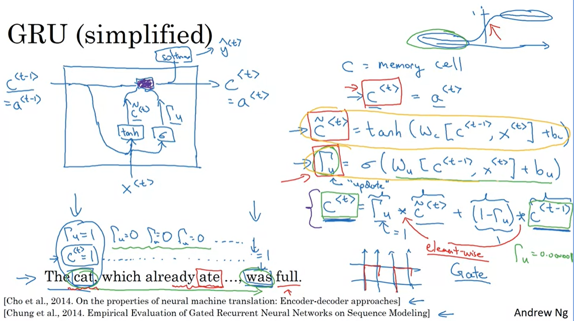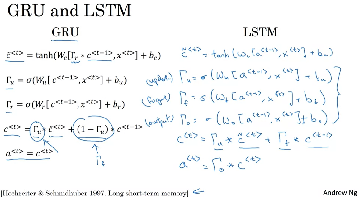 뇌피셜) 설명을 들으면 그럴듯하지만 사실 GRU의 개념이 머릿속에 완전히 잡히지는 않은 것 같다. 내가 이해한 바로는 GRU를 사용하면 일부원소에만 해당 timestep에서의 x input이 반영된다. 그리고 GRU 구조도 결국 Learning Algorithm 이므로 y_hat<t> 의 예측과 관련된 원소를 보존할지 바꿀지 결정하는 감마u라는 parameter를 추가하고 지속적으로 update함으로써 종국에는 긴 의존성을 갖는 원소들은 보존되고 중간의 word 에 대한 y_hat 값을 y값과 비슷하게 update 하기 위한 원소들은 값이 바뀔 것이다.