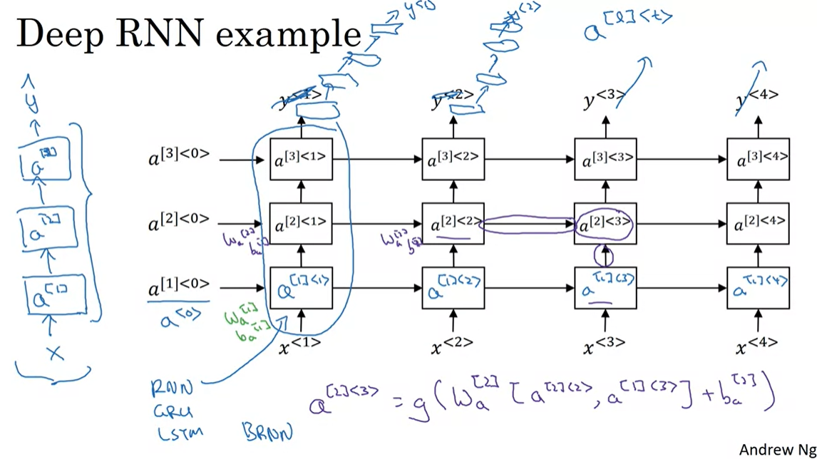 대충 예상했듯이 RNN의 같은 과정을 거꾸로 수행하면 된다. 순방향과 역방향에서 산출된 a 값을 모두 엮어서 기존 y_hat 을 계산하는 수식에 쳐넣으면 된다.