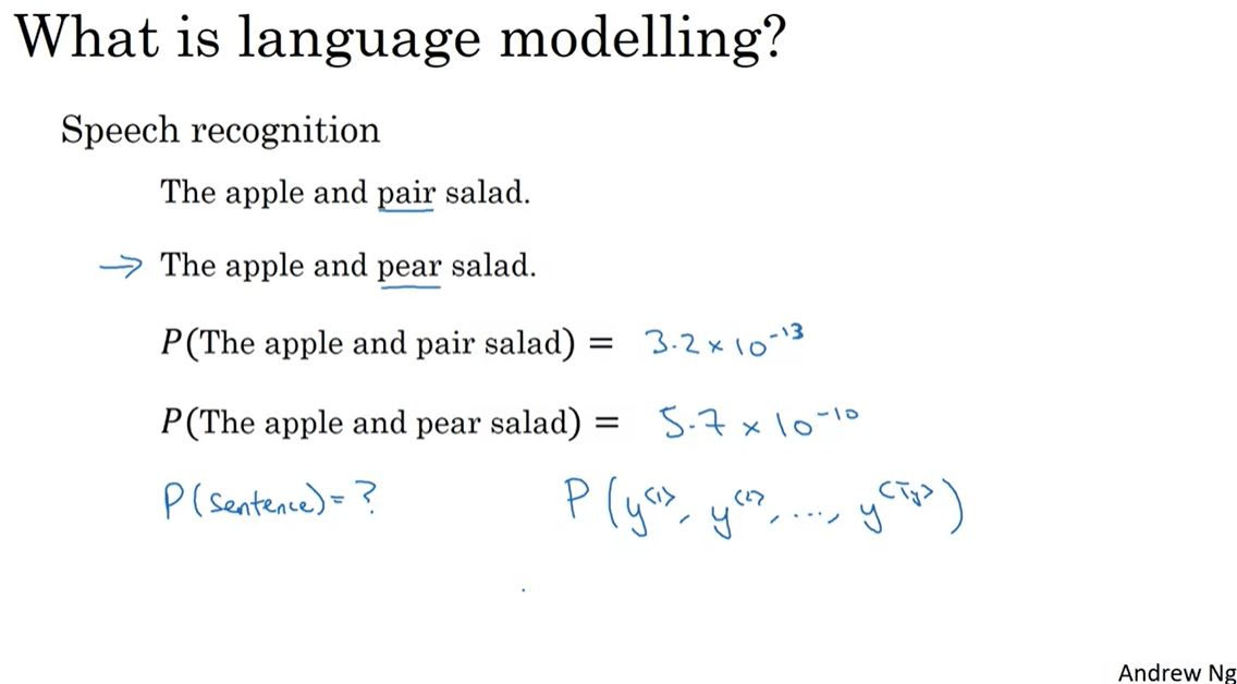 P(sentence) = P(y<1>, y<2>, ... ) = P(y<1>) * P(y<2> | y<1>) * P(y<3> | y<1>, y<2>) * ...
