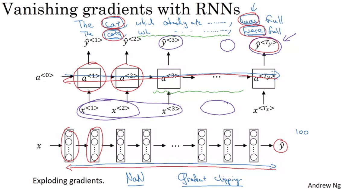 즉, cat-was, cat-were의 예시를 성공적으로 달성하기 쉽지 않다. 이상적이라면 위의 예시에서 단어끼리 떨어져 있더라도 cat이면 was, cats면 were을 사용해야하는데, 기초적인 RNN은 그런 문제를 잘 해결할 수 없다.