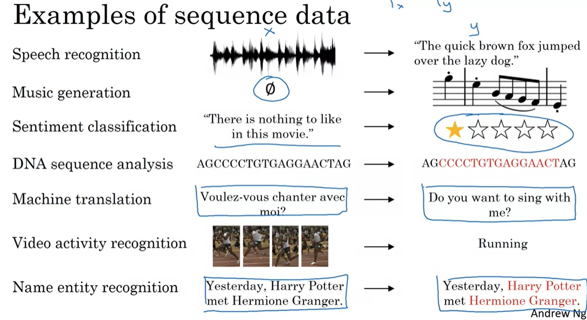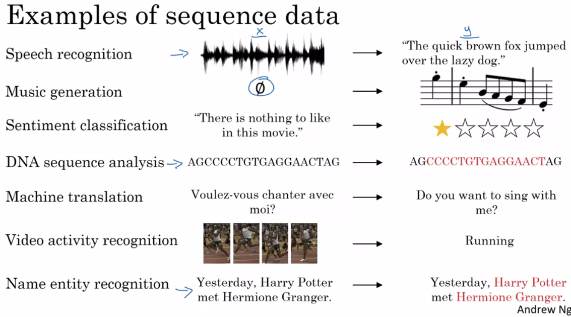 Speech Recognition을 한다고 했을 때, y<t> 는 각각 인식한 단어가 된다. 다 모으면 한 문장.