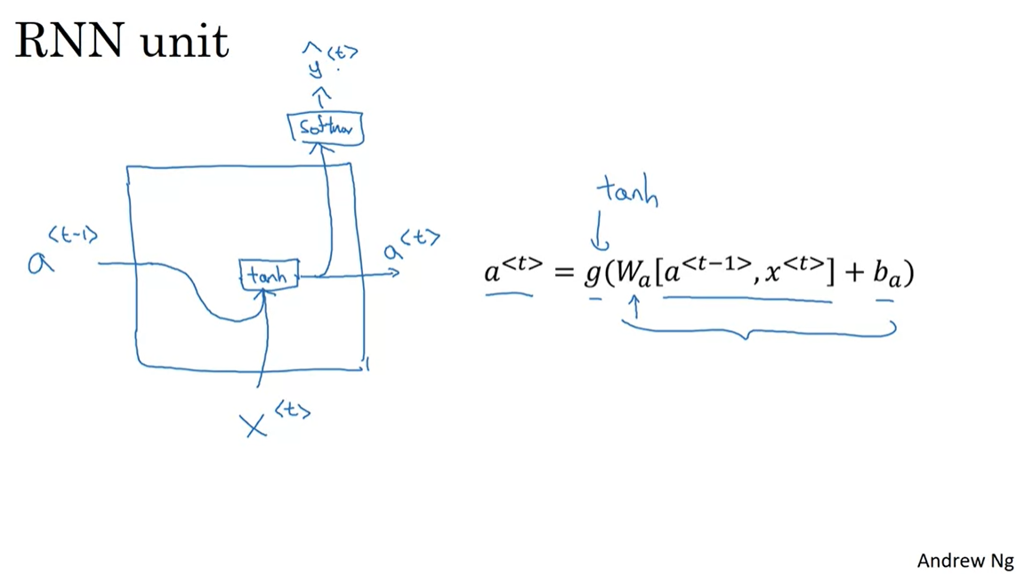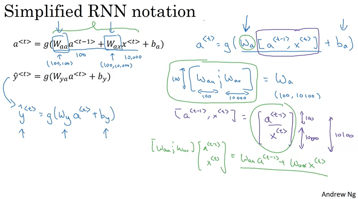 - Waa와 Wax를 가로로 이어붙이고(=Wa), a<t-1>과 x<t>를 세로로 이어붙인 후(=[a<t-1>, x<t>]) 둘을 곱하면 같은 연산결과가 나온다.