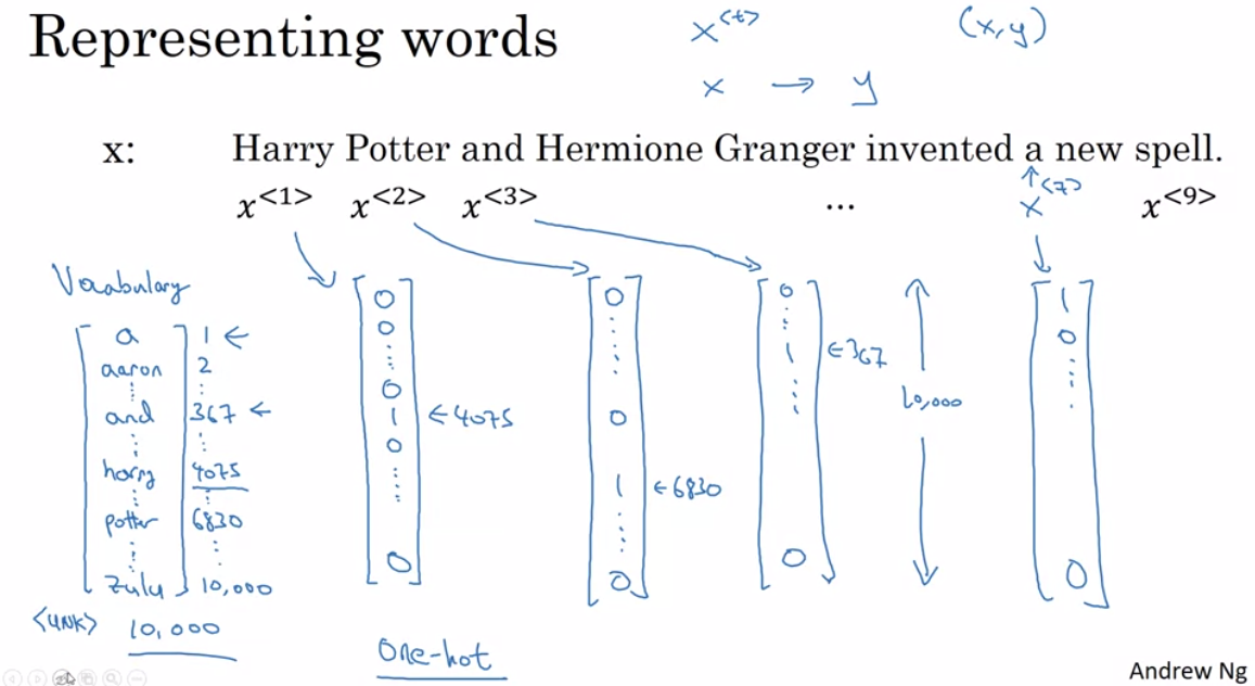 - 위의 예에서 1만개의 단어가 들어있는 사전이 있다고 하자. 그렇다면 x는 위와 같이 one-hot encoding으로 표현할 수 있다.