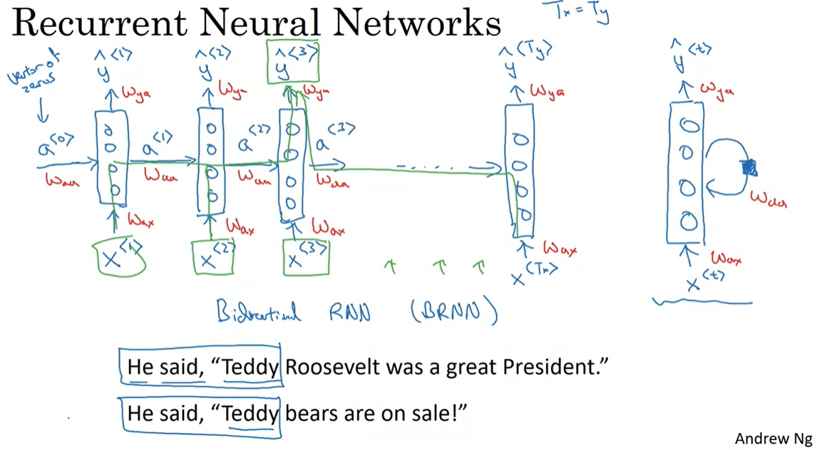 - 이 모델의 문제점은 구조상 earlier information 밖에 사용하지 못한다는 것이다. 예를 들어 위와 같은 두 문장이 있을 때, y<3>(Teddy가 이름인지 여부) 를 예측하기 위해서 He, said 두 단어를 활용하는데 이 두 단어만으로는 두 문장에서 차이를 발견할 수 없다. 뒤에서 해당 문제를 해결하는 비기를 알려준다고 한다.