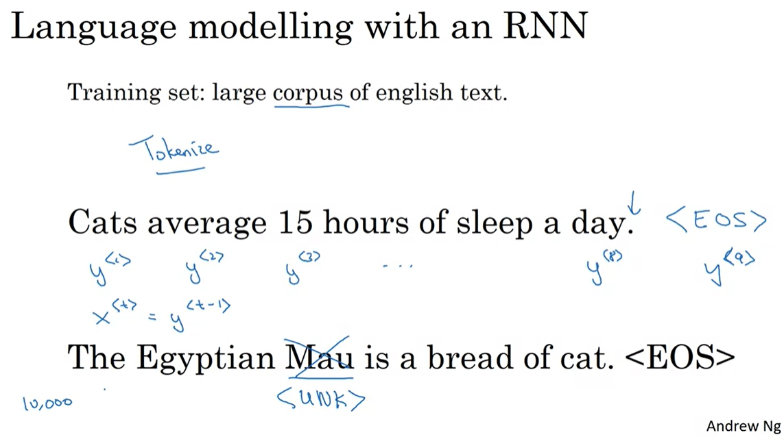 RNN을 위해서는 우선 tokenize를 해야한다. 일반적으로 단어단위로 쪼개며 문장 끝에는 <EOS(end of sentence)> 라는 토큰을 추가하여 문장이 끝났음을 알린다.