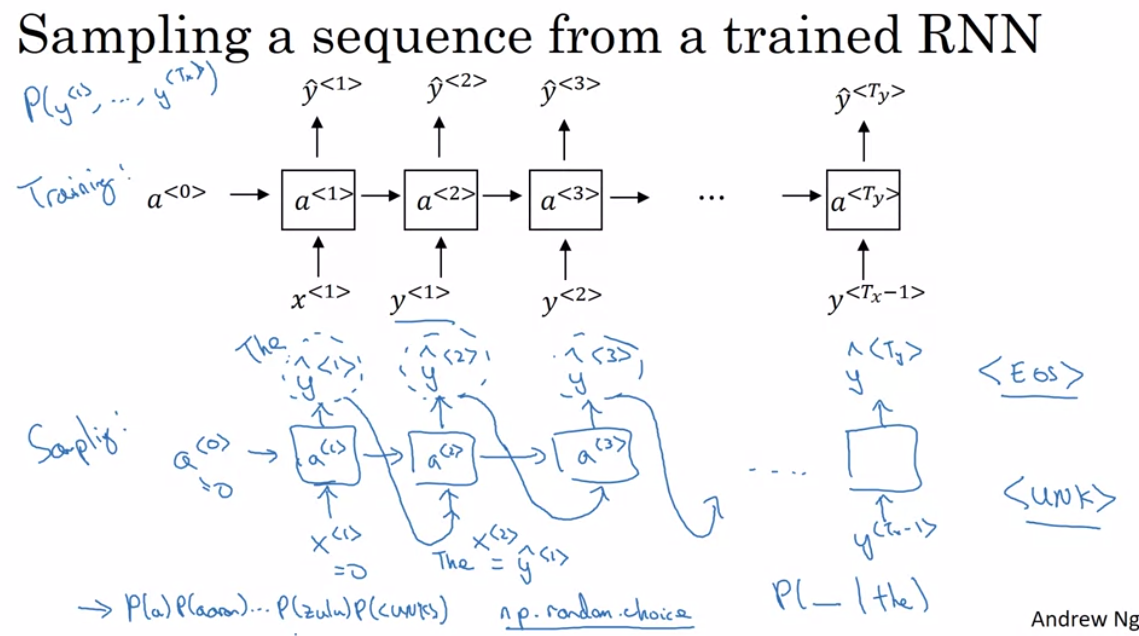 1. 먼저 a<0>과 x<0>를 영벡터로 초기화한 후, 문장의 첫 단어로 어떤 단어가 올지 확률을 예측하고 이걸 y_hat<1> 이라 한다. 이 단계에서는 어떠한 맥락도 파악할 수 없다. 단지 우리가 갖고 있는 10000개의 단어들이 처음 등장할 확률을 벡터화 한 것이 y_hat<1> 이다.