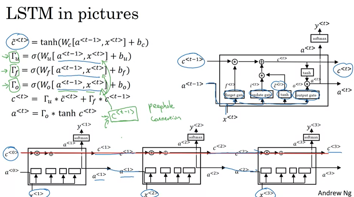 GRU와는 다르게 c<t>와 a<t>가 다르며 c<t>가 지나가는 빨간 라인을 통해 c<t>값이 보존된다.