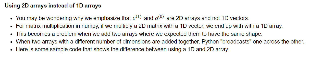 요약하자면, 1D랑 2D를 내적하면 1D array 가 산출된다. 우리는 모든 행렬을 2D로 만들어 줌으로써 행렬간의 연산에 일관성을 부여해준다.
