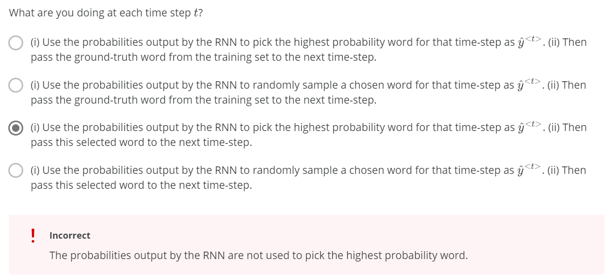 2. 다시 되새기자면, language model을 통한 random sampling sentences 에서 다음 step으로 넘기는 y_hat을 결정하는건 무작정 제일 높은 확률을 가진 단어를 선택하는 것이 아니라 그 확률대로 랜덤하게 뽑는 것. 즉 높은 확률이면 높은 확률로 뽑히겠지? 밑에 문제는 답이 4번.