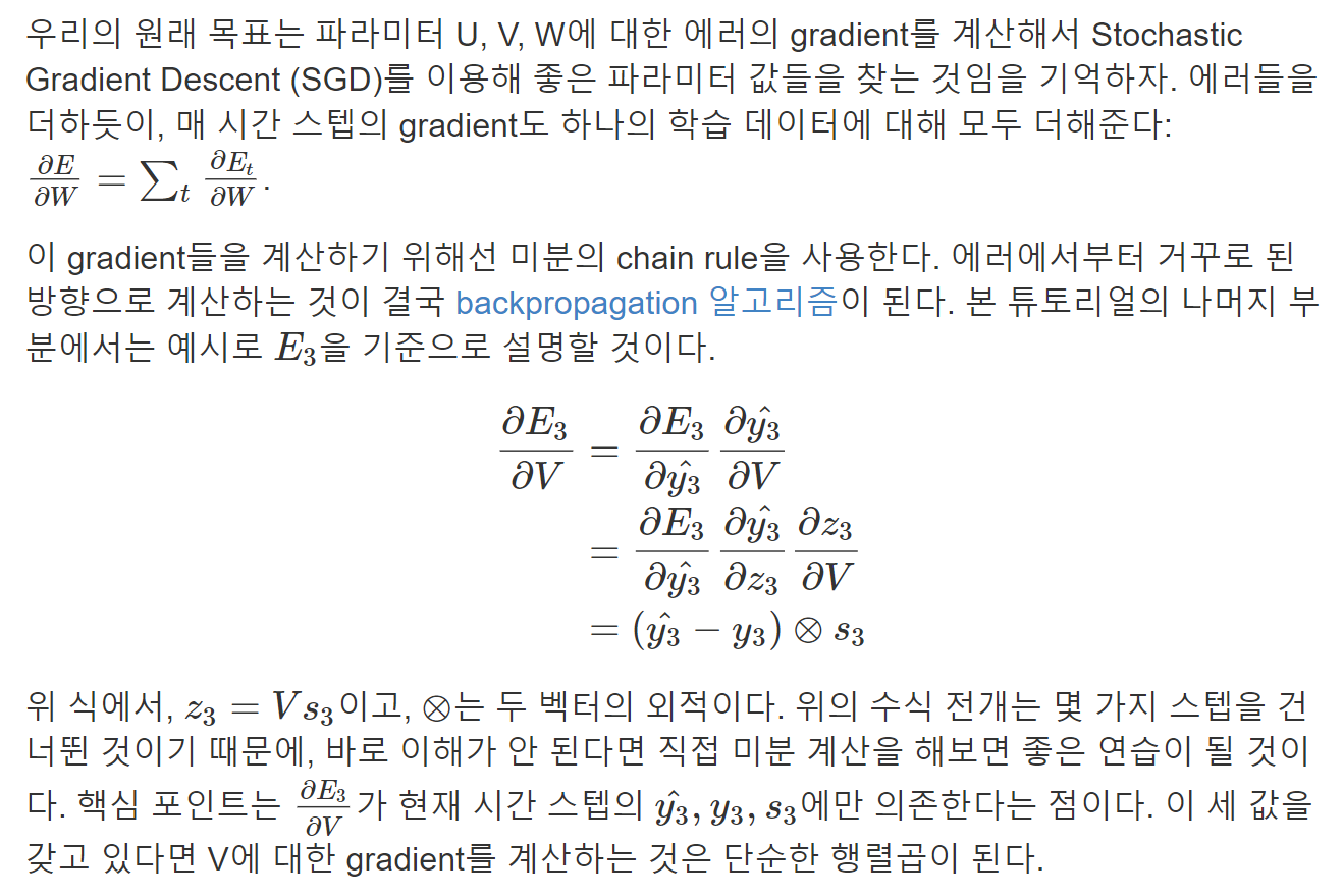 - 즉, (timestep 1에서 Loss(y1, yhat1)에 W가 영향을 끼치는 정도) + (timestep 2 에서 Loss(y2, yhat2)에 W가 영향을 끼치는 정도) + ... 를 모두 더하는 것. 생각해보면 지극히 정상적인 것이며 이것이 일반적인 Gradient Descent와 다른 BPTT의 핵심적인 특징이다. 자세한건 밑의 블로그를 참조하면 단박에 이해할 것.