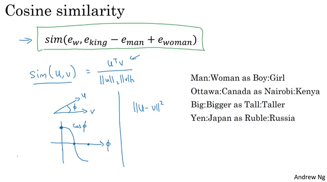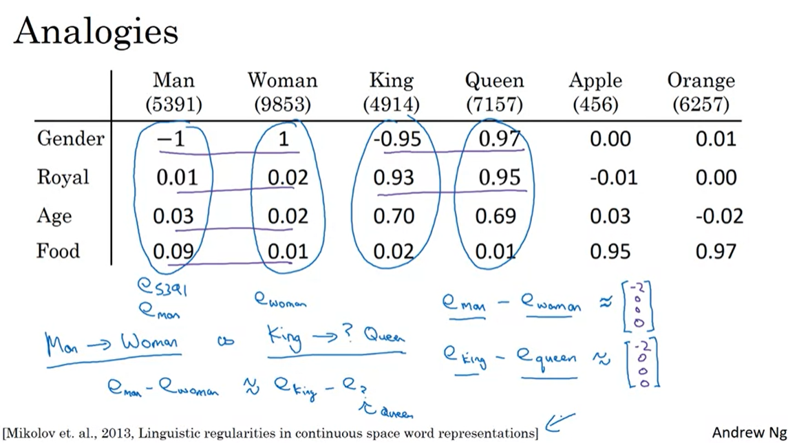 - 이러한 유추문제에 대한 답을 찾기 위해 우리가 정의한 word vector들에서 e_man - e_woman을 해보자.