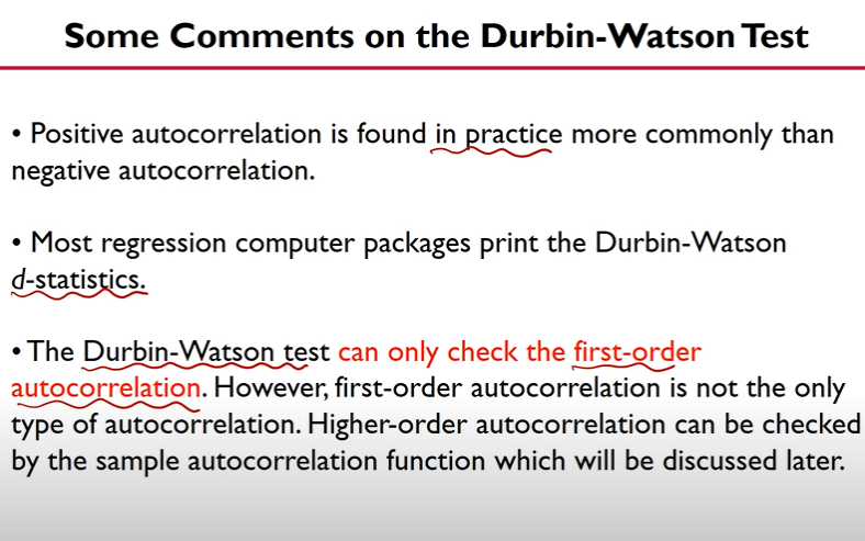 - nth-order는 n만큼 shift한걸 변수로 활용한다는 의미. Durbin-Watson test 는 1st order 밖에 확인할 수 없지만 higher order는 어떻게 알 수 있는지 나중에 알려준다고 함.