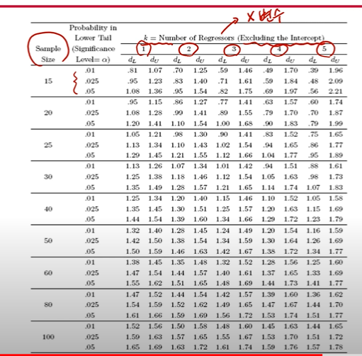 - 4라는 숫자를 이용한 이유는 d값의 분포가 4에서 빼주었을 때, 기존 유의수준과 dL, dU 값을 일률적으로 적용할 수 있어서가 아닐까 생각한다. 엄청 중요한건 아니니 대충 이렇게 이해하자.