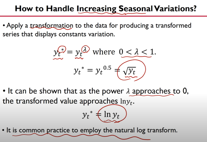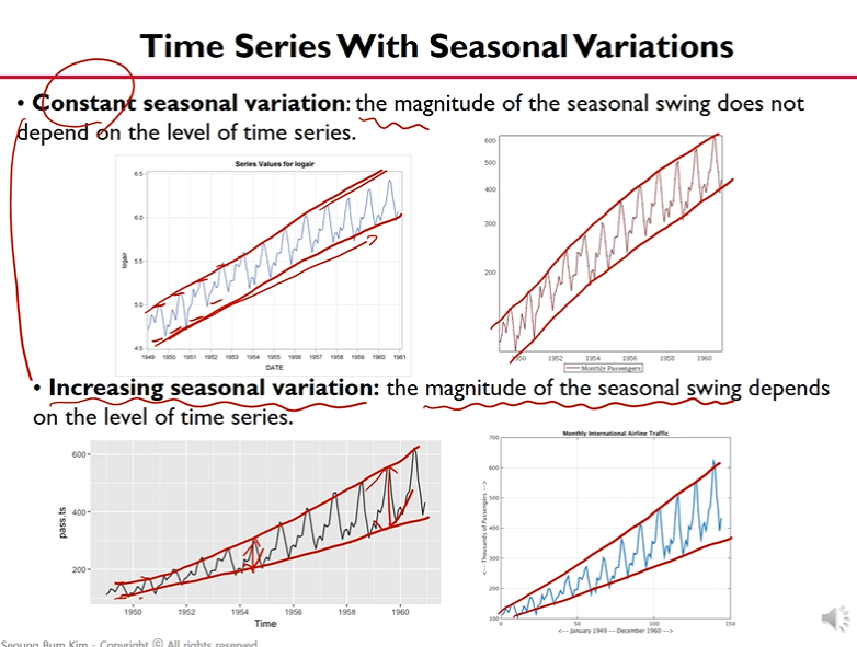 - Increasing seasonal variation의 경우 모델로 핸들링하기가 까다로움.