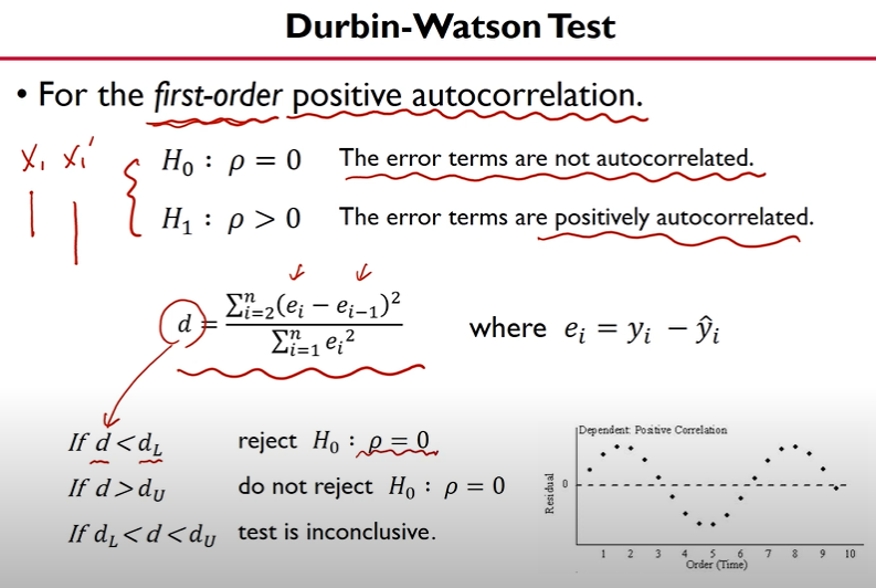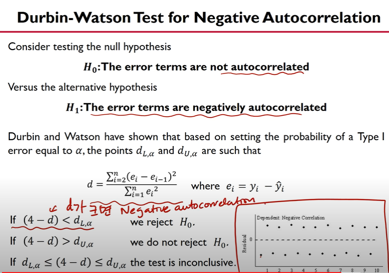 - negative autocorrelation의 경우, (4-d)를 dL 및 dU와 비교한다. d 값이 커질 수록 4-d 값이 작아지는 원리를 이용.