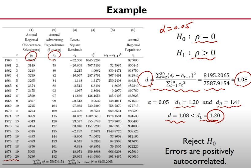 - d 는 수식상으로 positive correlation일 경우 시점i와 시점i-1에서 잔차의 부호가 같을 확률이 커서 e_i와 e_i-1의 차이가 적다. 따라서 특정 threshold dL 을 정하고 그 이하일 경우 귀무가설을 기각하고 대립가설을 채택한다.