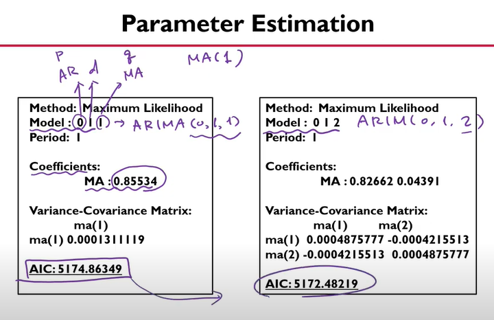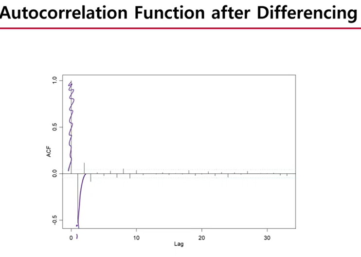 - MA(1) 이고 차분을 한번 했으므로, ARIMA(0,1,1) 이다.