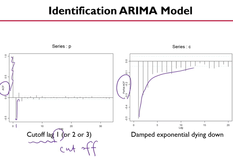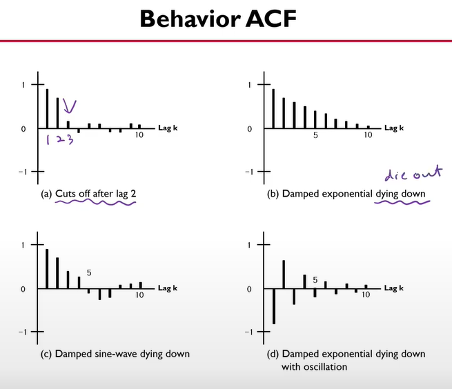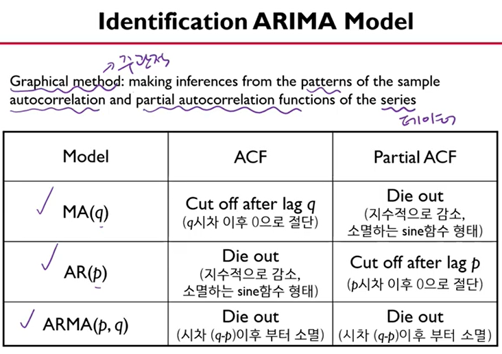 - 판단은 ACF와 PACF 를 보고 하는데, 각각의 조건들을 만족할 경우 MA, AR, ARMA 중 채택한다.