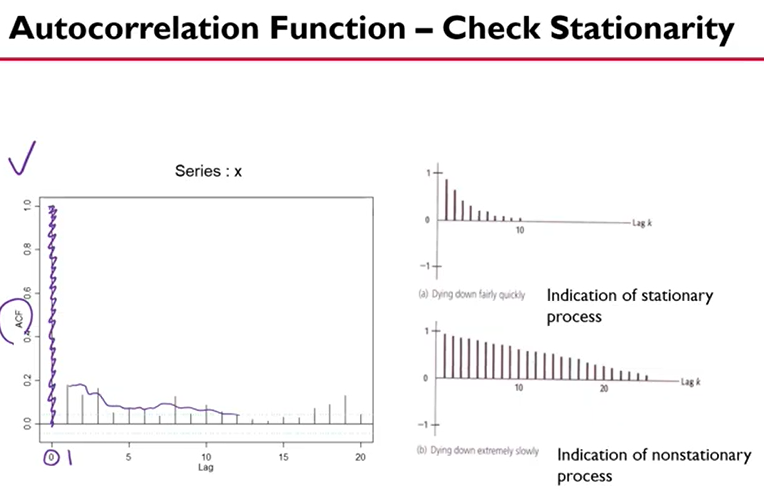 - ACF 그래프가 서서히 작아진다면 이는 non-stationary 일 가능성이 높고, 급격히 작아지거나 일정한 패턴이 없는 경우는 stationary 일 가능성이 높다.