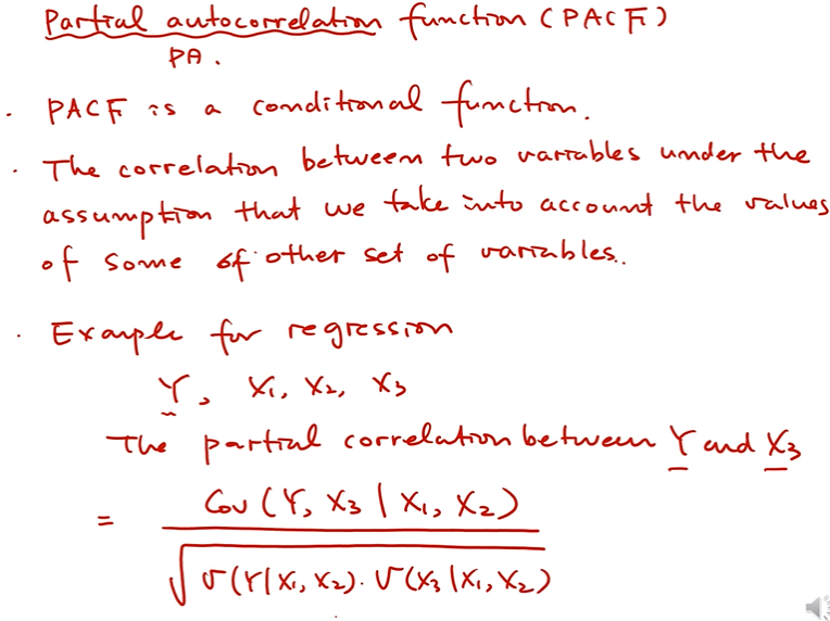 - 두 시점간의 PACF는 그 시점 사이의 값들이 주어졌을 때, 두 변수의 correlation 이다.
