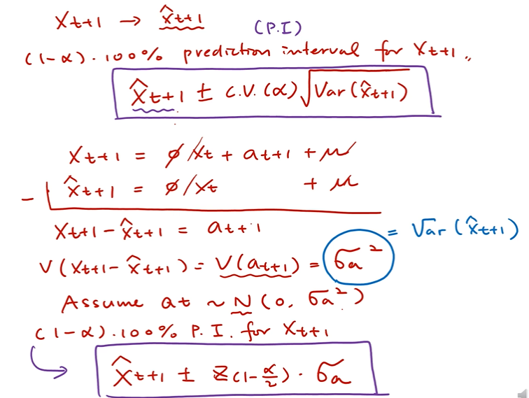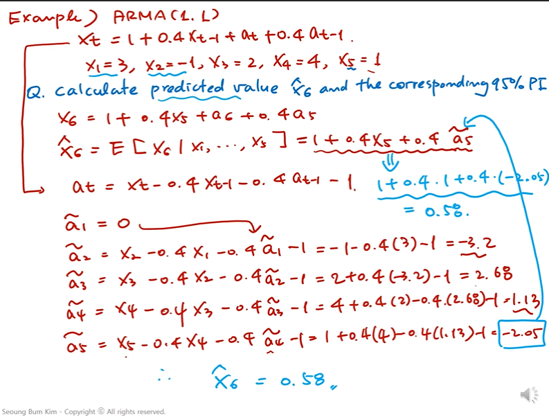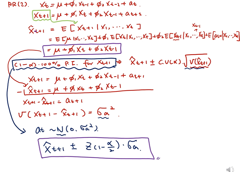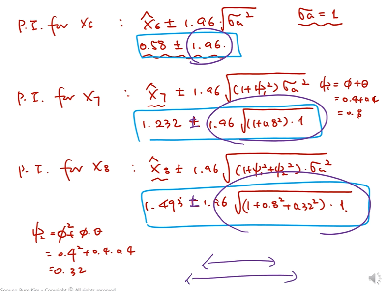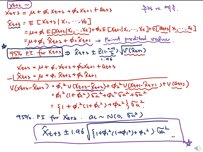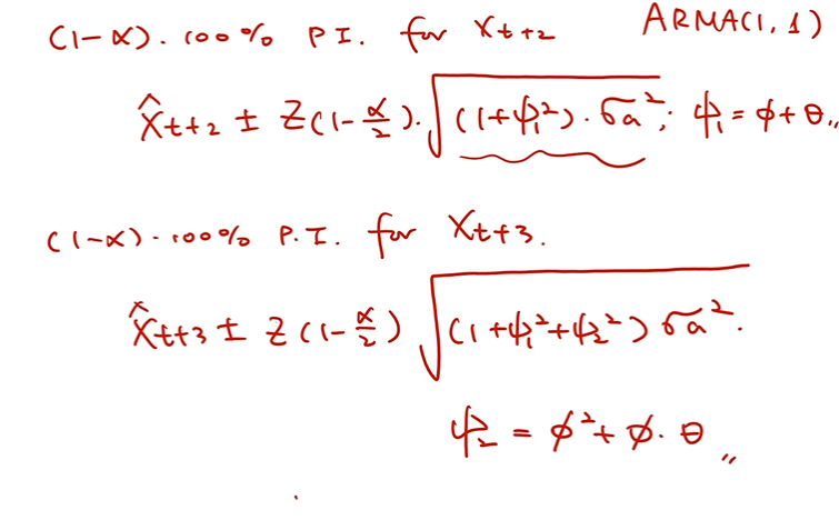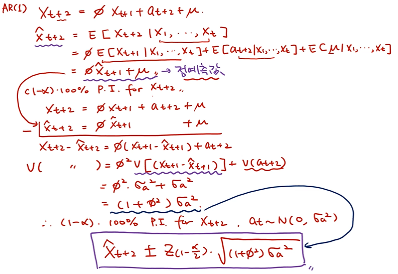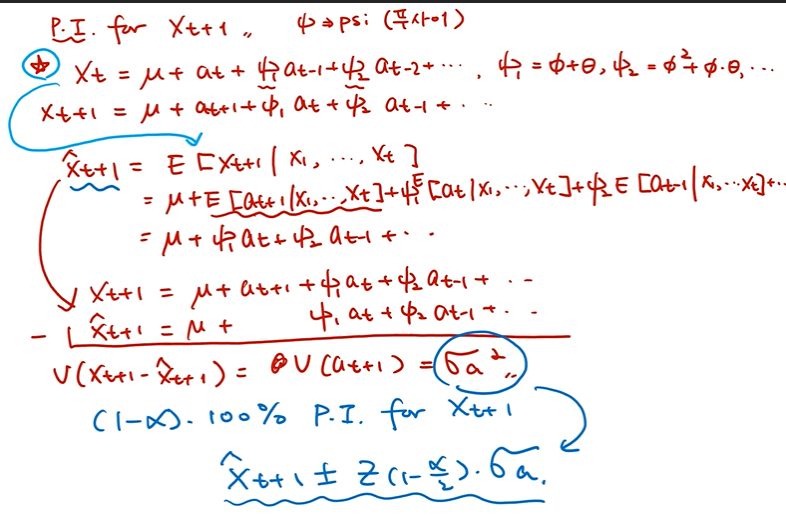 - 놀랍게도 한시점 뒤에 대한 PI 는 AR, ARMA 모두에서 같은 식이 도출된다.