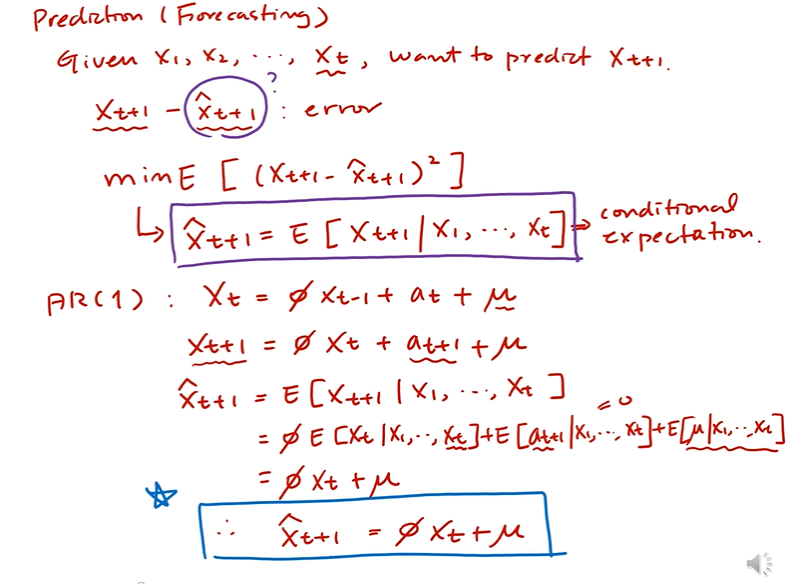 - E[at+1 | X1...Xt] 에서 t 까지의 정보만 제공된 상태이므로 t+1 시점에서의 a 값에 대한 기댓값은, a가 시점에 상관없이 '기댓값'이 0이므로 0이라고 봐야한다.