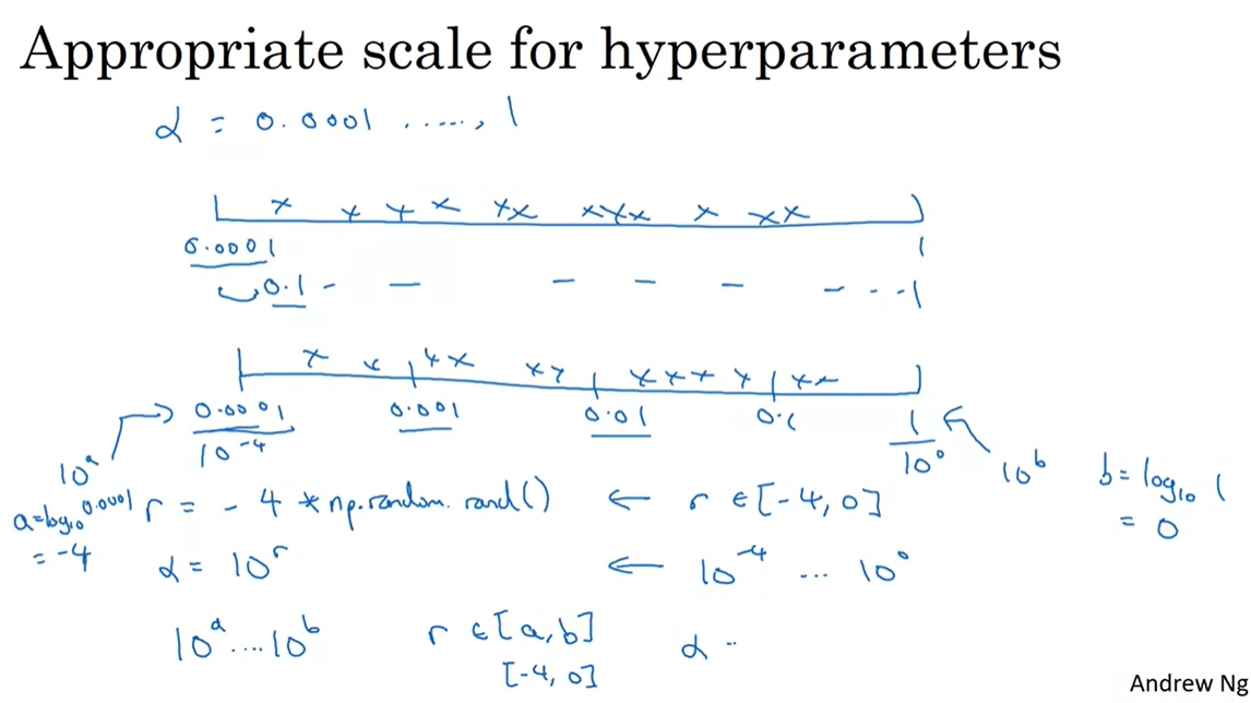 만약 layer의 개수나 unit의 수와 같이 정수값의 경우 그냥 특정 범위를 설정해놓고 랜덤으로 추출해도 문제가 없으나, learning rate나 beta값의 경우 0.00001 ~ 1 의 범위(예를 들어)에서 hyper parameter를 뽑아야한다. 단순히 저 범위에서 random으로 sampling을 하게 되면 0.00001 과 0.0001 사이의 수들은 선택되기 어려워지고 90프로 이상은 0.1~1의 범위에서 뽑혀진다.