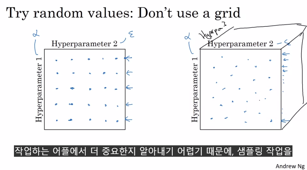 이유는 여러개의 hyperparameter 중에 뭐가 중요한지 모르며, random으로 할 경우 더 많은 값을 시도해볼 수 있기 때문이다.