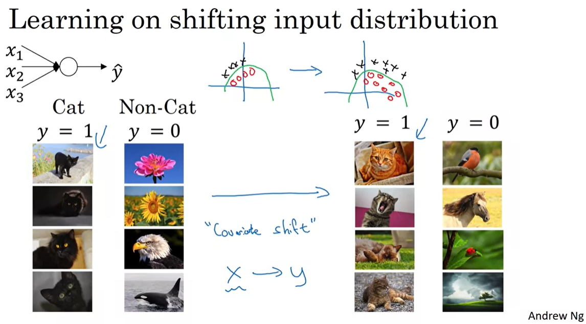 데이터의 변화가 생길 경우, 그 변화에 의해 알고리즘을 수정해야할 상황이 있고, 그 데이터의 변화를 Covariate Shift라고 한다. 위의 예시에서 검은 고양이만 학습시켰다가 컬러풀한 고양이 데이터를 넣으면 제대로 작동못하는 상황이 생김.