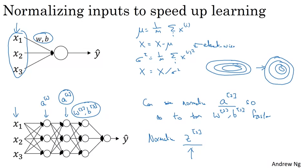 학습 속도를 높이기 위해 feature들을 Normalization하는 작업은 꼭 필요한데, 이를 통해 feature들의 scale을 맞춰주어 gradient descent 의 속도를 물리적으로 높일 수 있기 때문이다. 이건 deep neural network에도 똑같이 적용된다.