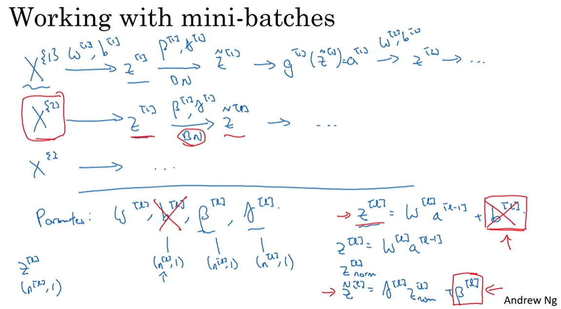 우리는 이제 W, b, beta, gamma 이 4가지를 update 해야한다. 그런데, 자세히 살펴보면 z를 z_norm으로 만드는 과정에서 평균을 빼주고 표준편차로 나누어주는데 이 과정에서 b 값은 사라진다. 따라서 우리는 이제 b를 고려할 필요가 없어지므로 z = wa 로 정의하고 시작하면 된다.
