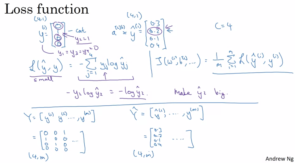 Loss 함수는 위와 같고 이를 이용해 구한 모든 example m에 대한 Cost function은 J(W,b)와 같다. Loss 함수를 잘 보면 y=1 일때의 y_hat과 실제 y(1)에 대한 Loss 값을 산출한다.